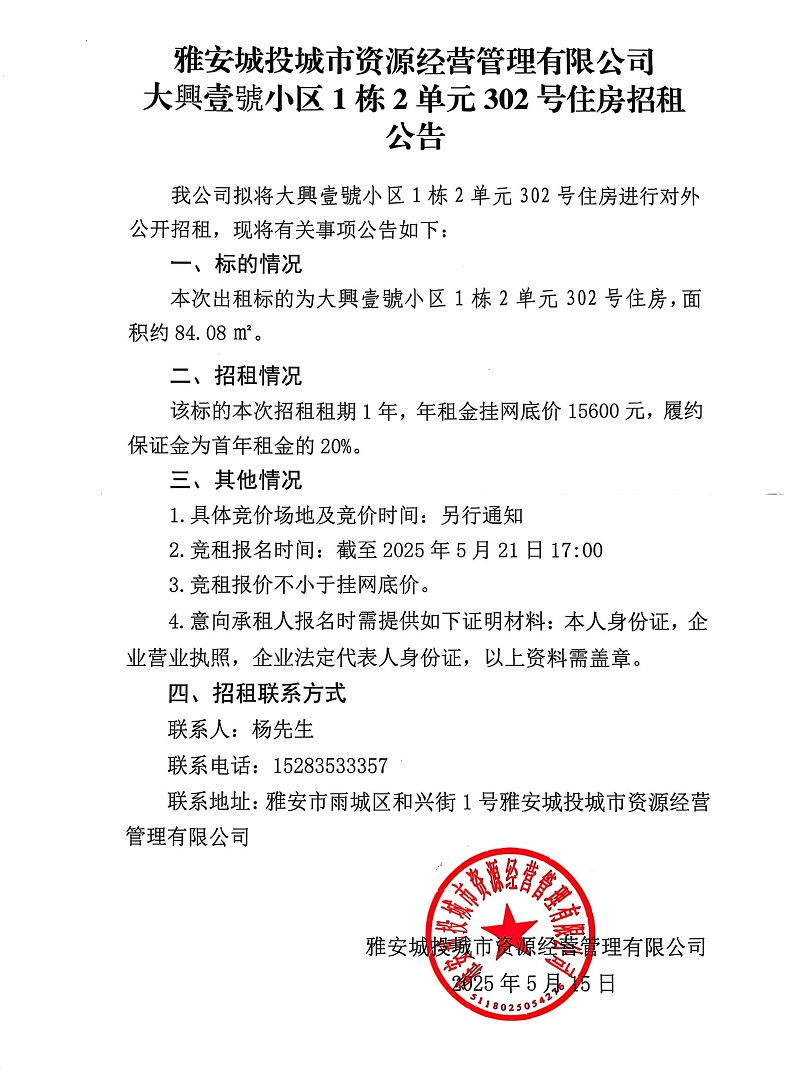 雅安城投資源經營管理有限公司大興壹號小區(qū)1棟2單元302號住房招租公告