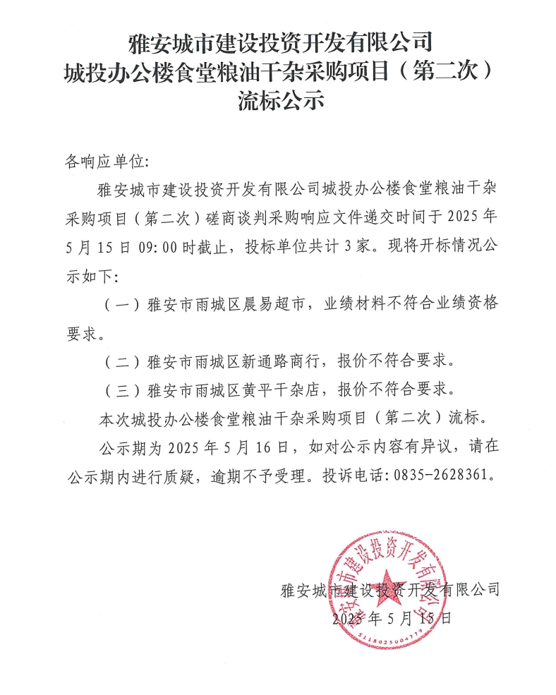 雅安城市建設(shè)投資開發(fā)有限公司城投辦公樓食堂糧油干雜采購項(xiàng)目(第二次)流標(biāo)公示