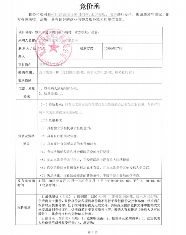 雅州印建設(shè)項(xiàng)目廢舊鋼材,木方模版出售競(jìng)價(jià)公告