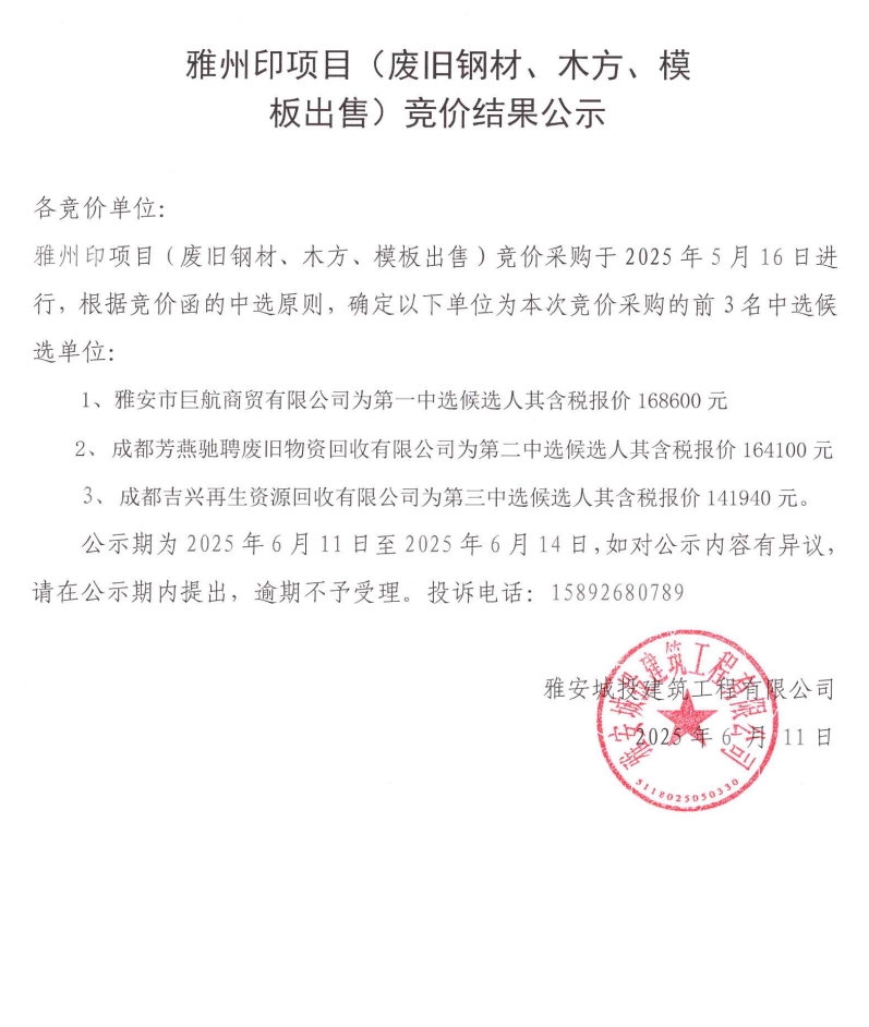 雅州印項(xiàng)目(廢舊鋼材、木方、模版出售)競價(jià)結(jié)果公示