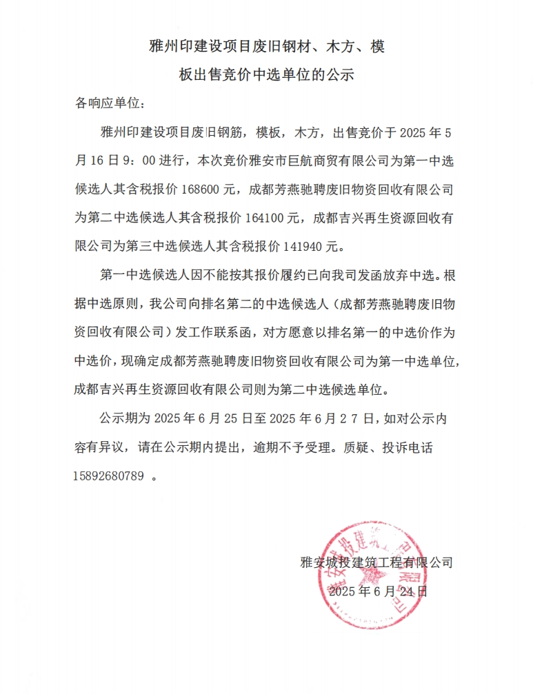 雅州印建設(shè)項目廢舊鋼材、木方、模板出售競價中選單位的公示