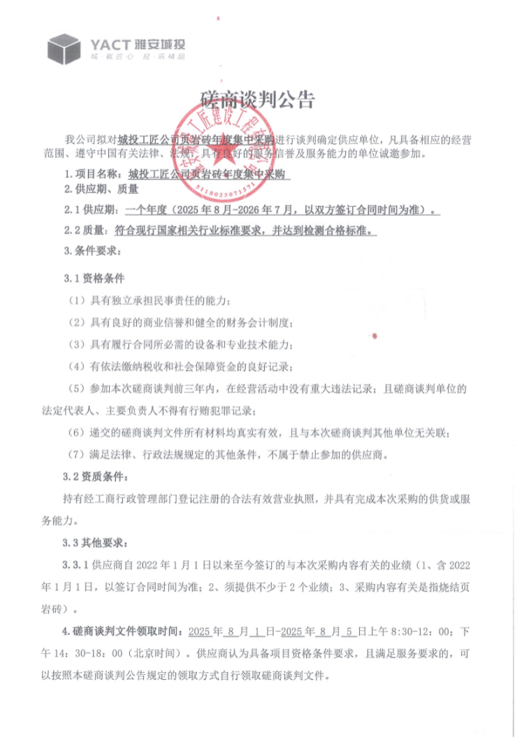 城投工匠公司頁巖磚年度集中采購(gòu)磋商談判公告