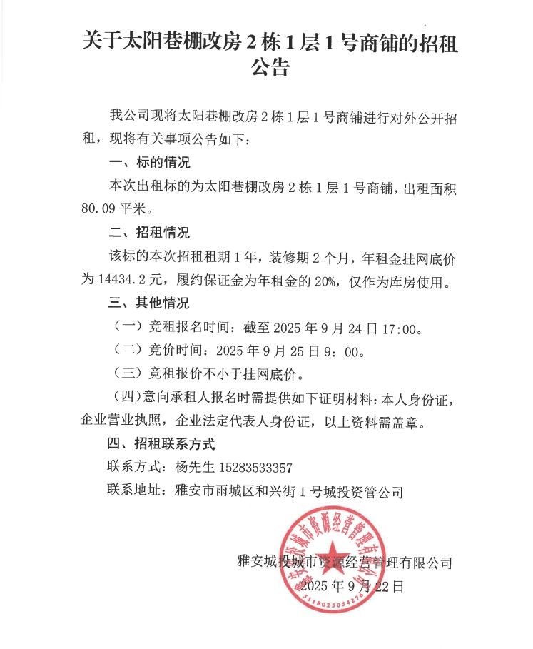 關(guān)于太陽(yáng)巷棚改房2棟1層1號(hào)商鋪的招租公告