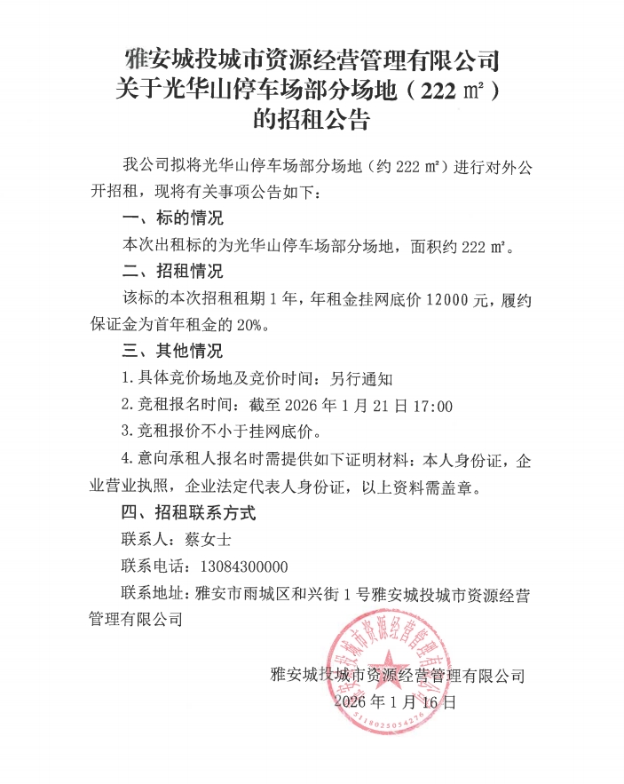 雅安城投城市資源經(jīng)營管理有限公司關(guān)于光華山停車場部分場地(222㎡)的招租公告