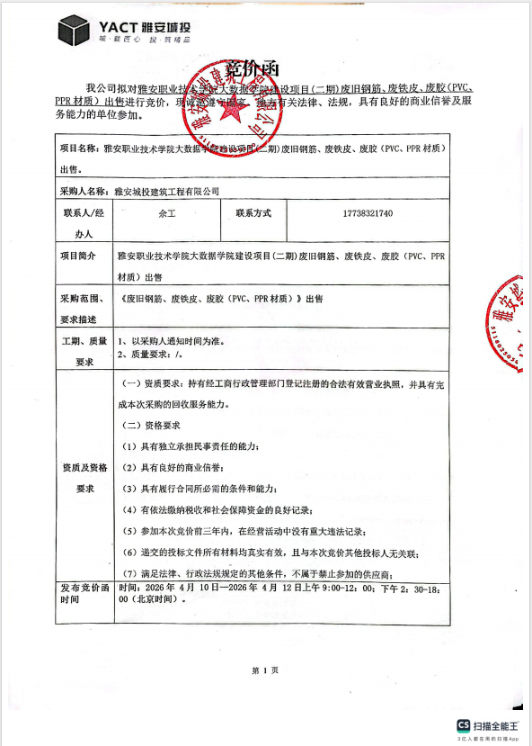 雅安職業(yè)技術(shù)學院大數(shù)據(jù)學院建設(shè)項目(二期)廢舊鋼筋、廢鐵皮、廢膠(PVC、PPR材質(zhì))出售