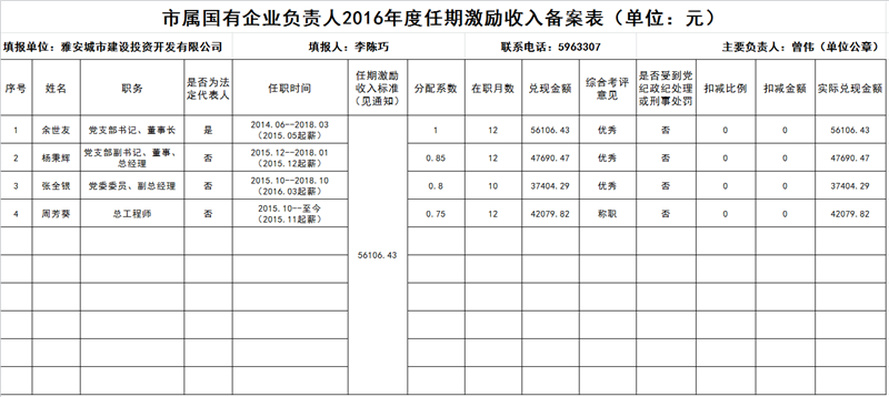 市屬國有企業(yè)負責人2016年度任期激勵收入備案表